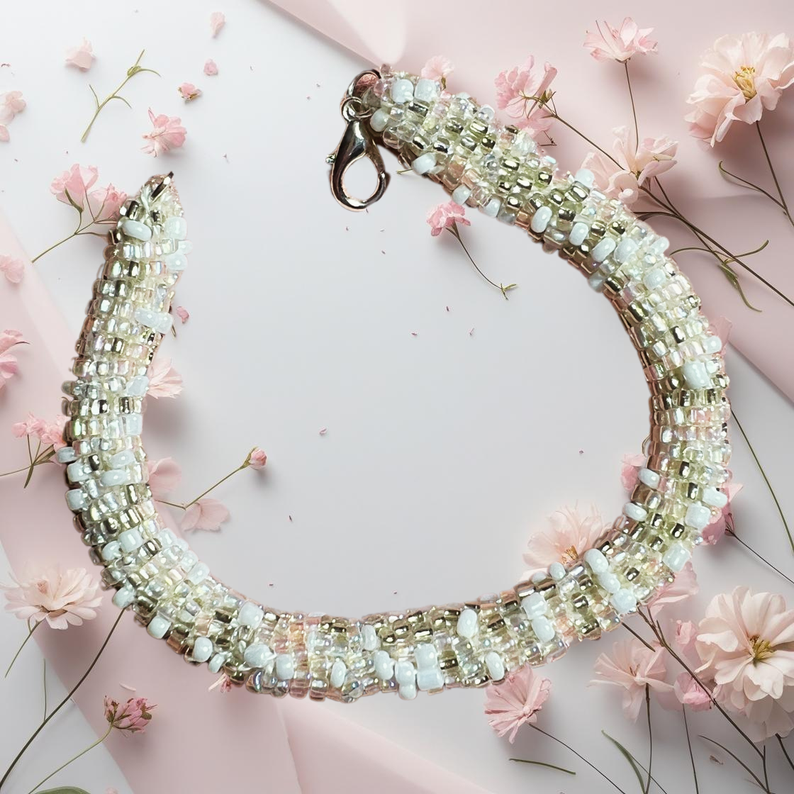 Timeless and delicate, this handmade bead rope bracelet is crafted bead by bead in soothing shades of pink and pearly white. Its subtle shimmer and soft hues make it a versatile piece — perfect for everyday elegance or special moments.