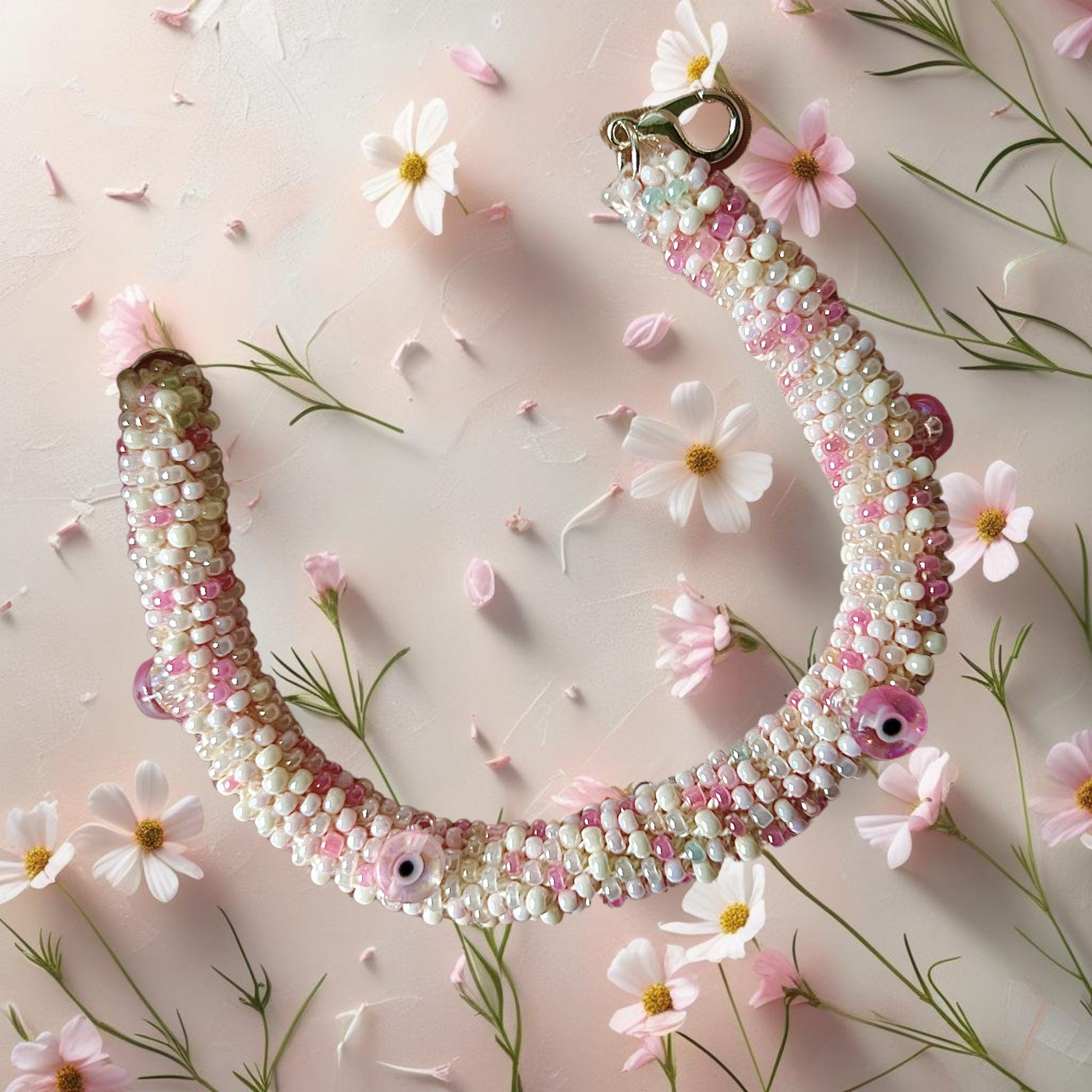 Timeless and delicate, this handmade bead rope bracelet is crafted bead by bead in soothing shades of pink and pearly white, accented by a few unexpected blue beads for a touch of contrast. Woven throughout are eye of protection beads, subtle yet powerful symbols believed to ward off negative energy and offer quiet strength to the wearer.